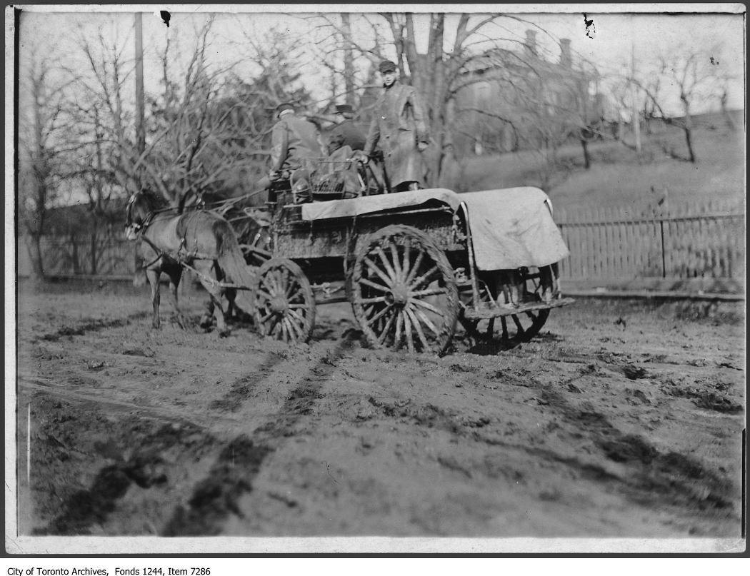 Fire reel on muddy road. – [ca. 1910] Item consists of one photograph, possibly taken at Earlscourt or on Davenport Road south of the hill.