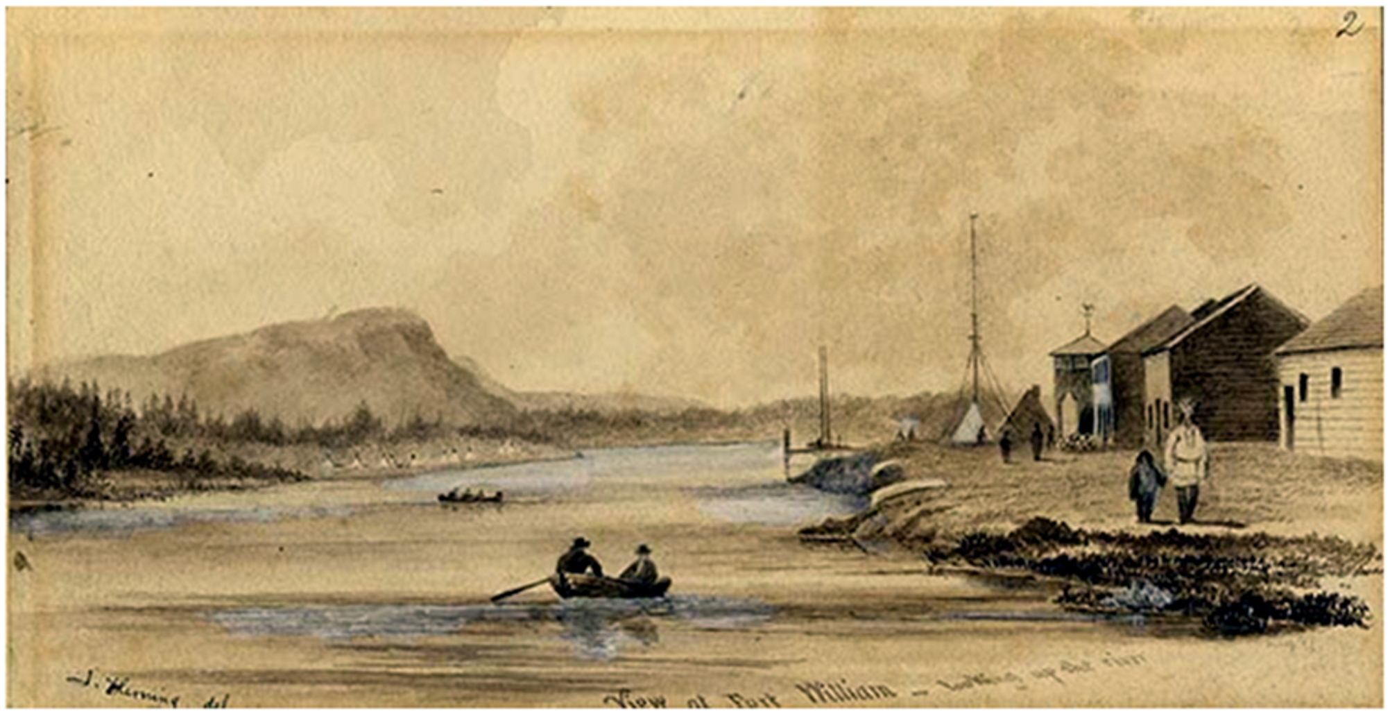 John Arnot Fleming. View at Fort William – looking up the river, Ontario 1857 Sepia water colour over pencil J. Ross Robertson Collection JRR 2319.
