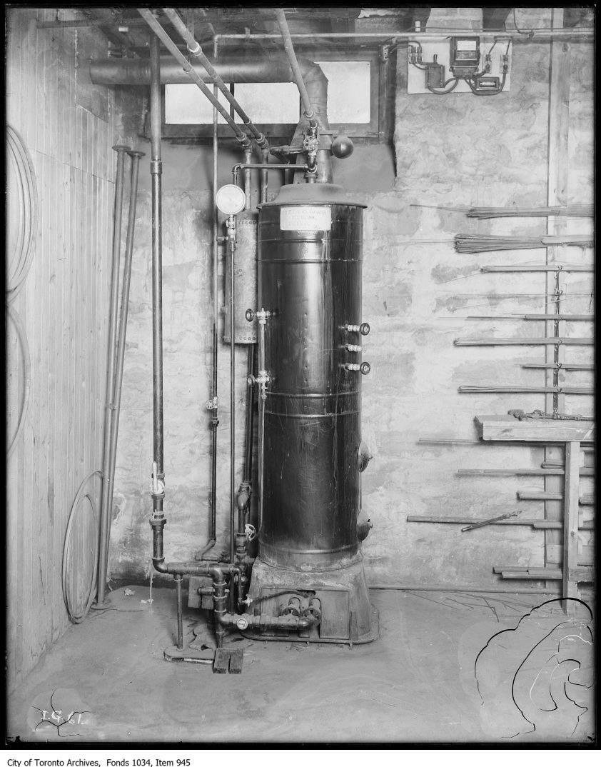 The Process of Making Tires: Gas steam boiler making rubber tires in stone-walled basement ca. 1922
