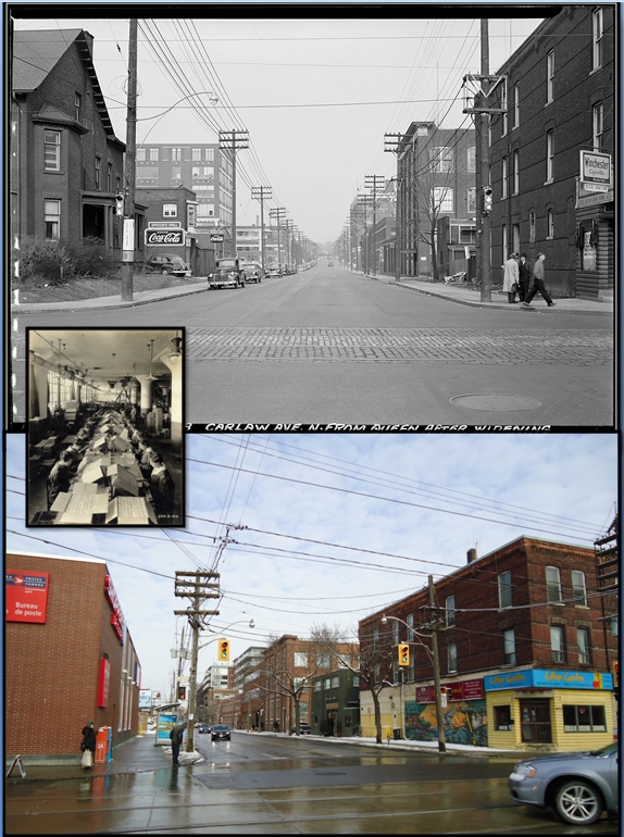 Hydro Building 2010, photo by Julia Patterson. Note that the Hydro Store no longer exists and the entrance has been bricked up.Wrigley factory Then and NowCarlaw Ave Then and Now: Looking south from Dundas Street.