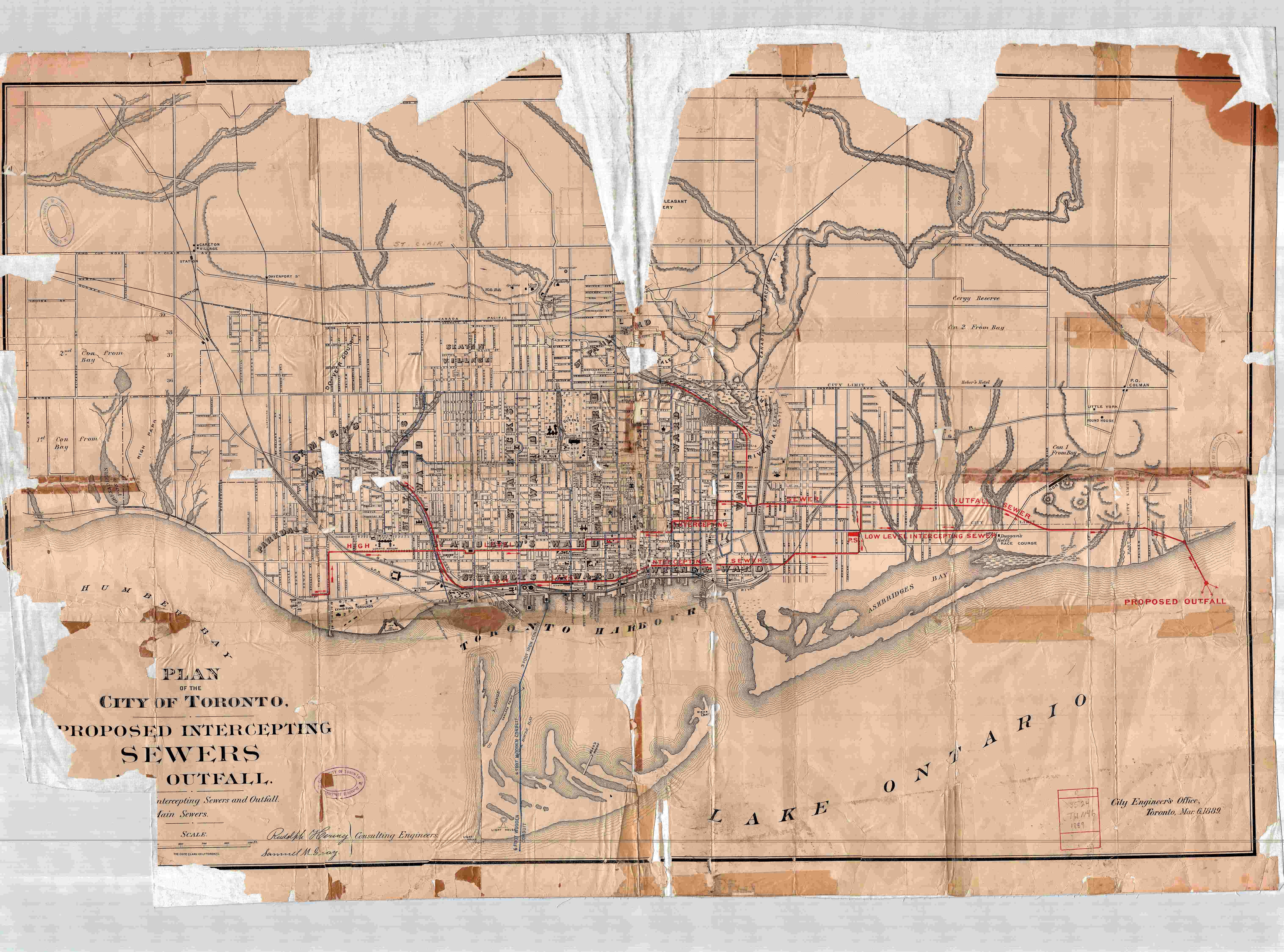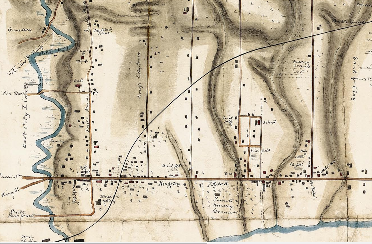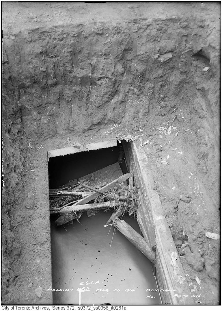 Boston Avenue entrance to Wrigley Factory 1917.Carlaw look north on Queen Then and Now. Women packing soap into crates at Colgate-Palmolive.John Anderson Carlaw for whom Carlaw Avenue was named.Construction/excavation on the course of Heward’s Creek, winter, 2015. This hole behind a store on the south side of Queen Street between Pape and Winnifred shows that ground water is still flowing along the course of the old creek. Note the layers or strata in the bank of the dig. A band of rusty material (broken and burnt bricks) marks the presence of an old brickyard some five feet below the current ground level. Photo by Joanne DoucetteHewards Creek in a box drain on Pape Avenue. Box drains were the simplest form of sewer. Between 14 to 18 inches wide, they were made of wood, collapsed easily and were often blocked by debris. They were replaced by tile drains or pipes and later by concrete culverts. The lower part of this creek was put in a drain before 1904.Leslieville 1851 showing the subdivision near the Leslie Street School. The lots are numbered from east to west. Heward Creek flowed through Lots 12 and 13.Leslieville 1868. From west to east lie the Don River, Heward Creek, Leslie Creek, Hastings Creek and Ashbridges Creek. Other landmarks include a number of brickyards, George Leslie’s Toronot Nursery Grounds, the Leslie School, the Wesleyan Chapel at Vancouver and Queen and George Leslie’s Post Office marked P.O. where Leslie Creek crossed Queen St. E. (then called Kingston Road).Southern Portion 1884 PLAN OF SURVEY of Lot 13 and Broken Front, showing the course of Heward/Holly Creek.Leslieville 1884 Goad’s Atlas