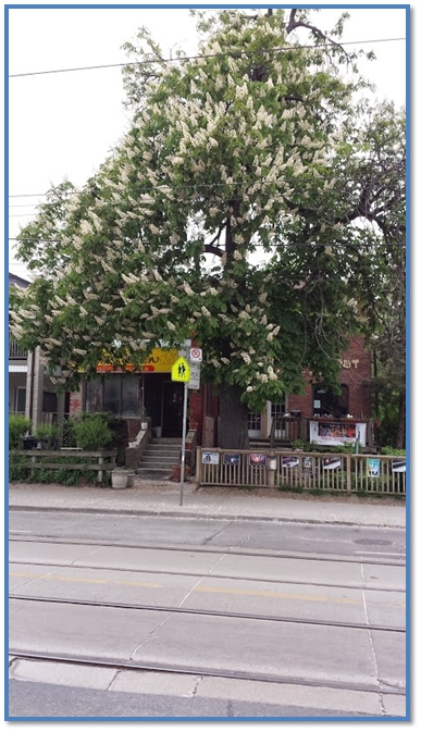 Horse Chestnut planted by George Leslie, one of the survivors of rows of trees that lined both sides of Queen St E in Leslieville. This one is at Queen and Caroline.