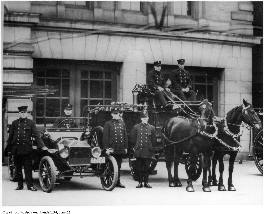 Horse-drawn fire reel and car, Adelaide Street West fire hall. – 1919