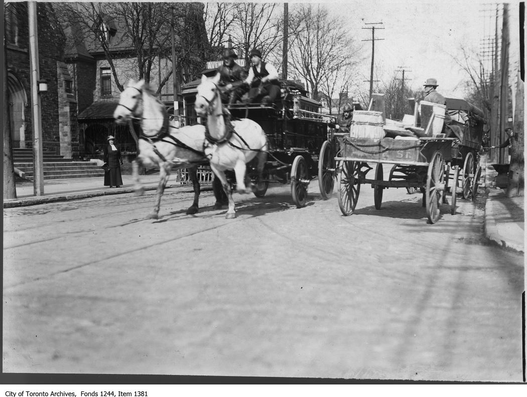 Previous Image Next Image Horse-drawn fire reel, Avenue Road. – [1908?] Horse-drawn fire reel, Avenue Road. – [1908?]
