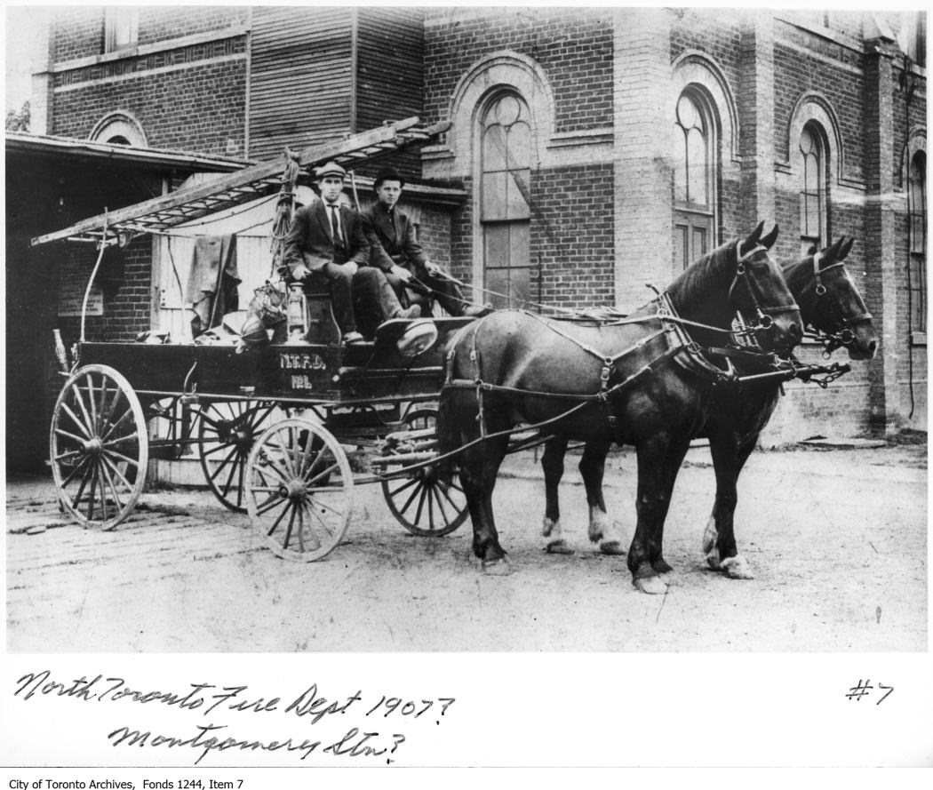 Horse-drawn fire wagon with ladder. – [ca. 1907] Item consists of one photograph, possibly showing North Toronto Fire Department on Montgomery Avenue. *** Local Caption *** Item consists of one photograph, possibly showing North Toronto Fire Department on Montgomery Avenue.