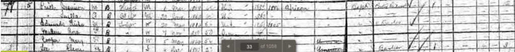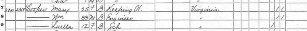 In the 1880 US Census for Washington in the District of Columbia, William Cooper is still listed as an Engineer. William was 46; Mary 37. The family are all listed as “mulatto”. William’s parents were born in Virginia. Mary Cooper is listed as “Keeping House” Both William and Mary were born in Virginia. Louella is listed as “Lewelyn Price, 23, at home”; Grandison was 25 and worked as a Government Messenger. Luella and Grandison’s only child, a son, was born on August 27, 1877, in Washington, District of Columbia, USA and apparently died in infancy as he is not in any other record. They later but adopted a son, Robert C. Lynch, born in 1881 in the USA. Robert J. Lynch became a waiter on the railway.