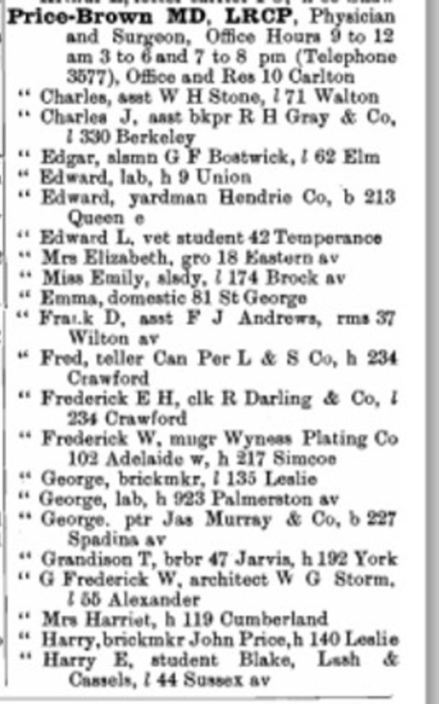 In R L Polk & Co.’s Toronto City Directory 1888 Grandison Price is listed as a barber with a business at 39 Jarvis Street, but residing at 345 Parliament Street. He was a barber in 1891 but soon became a porter on the railroad and worked for the CPR. In 1892 the Prices were living at 192 York Street, the heart of Toronto’s black community, while Grandison worked in his shop on Jarvis. In the Toronto City Directory of 1894, Louella is listed as a dressmaker living at 146 York with her business in the house. For many years she ran a boarding house. Prominent members of that community, including Elisha Edmunds and John Hubbard, boarded with the Prices. By 1893 Luella had her own restaurant at 192 York Street. By 1896 they were living on Morse Street in the East End as the wealthy landowners of York Street cleared the houses to build offices and factories.