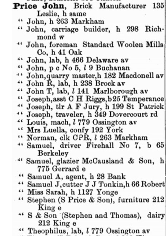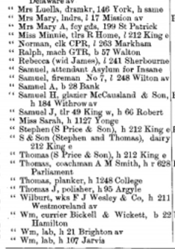 When the Civil War was over, black Americans returned to the US though not to the South. Instead they moved to the large cities of the American north and mid-west: Detroit, Pittsburgh, Chicago, etc. While some stayed most black people in Leslieville joined the exodus. Others came north to escape Jim Crow laws and the violent racism of the South. Some time between 1877 and 1885 the Prices moved north to Toronto. By 1887 the Prices were living in Toronto where Luella was working as a dressmaker. They lived downtown on York Street. The heart of the business district now was the heart of Toronto’s black community then. They were members of the First Baptist Church when they lived in Toronto. The Prices were devout, warm and generous people. They must have saved every penny and worked long hours to build up savings to invest in their businesses.