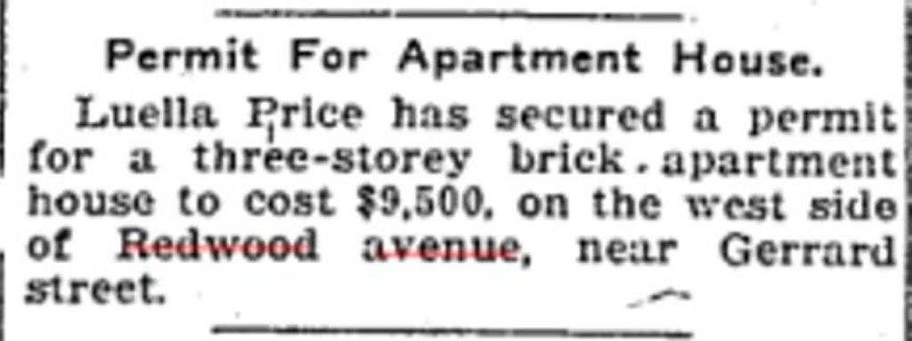 In 1915, at the age of 57, Luella Price had secured a permit for a three-storey brick apartment house to cost $9,500,at 6 Redwood Avenue. (Toronto Star, Feb. 6, 1915)