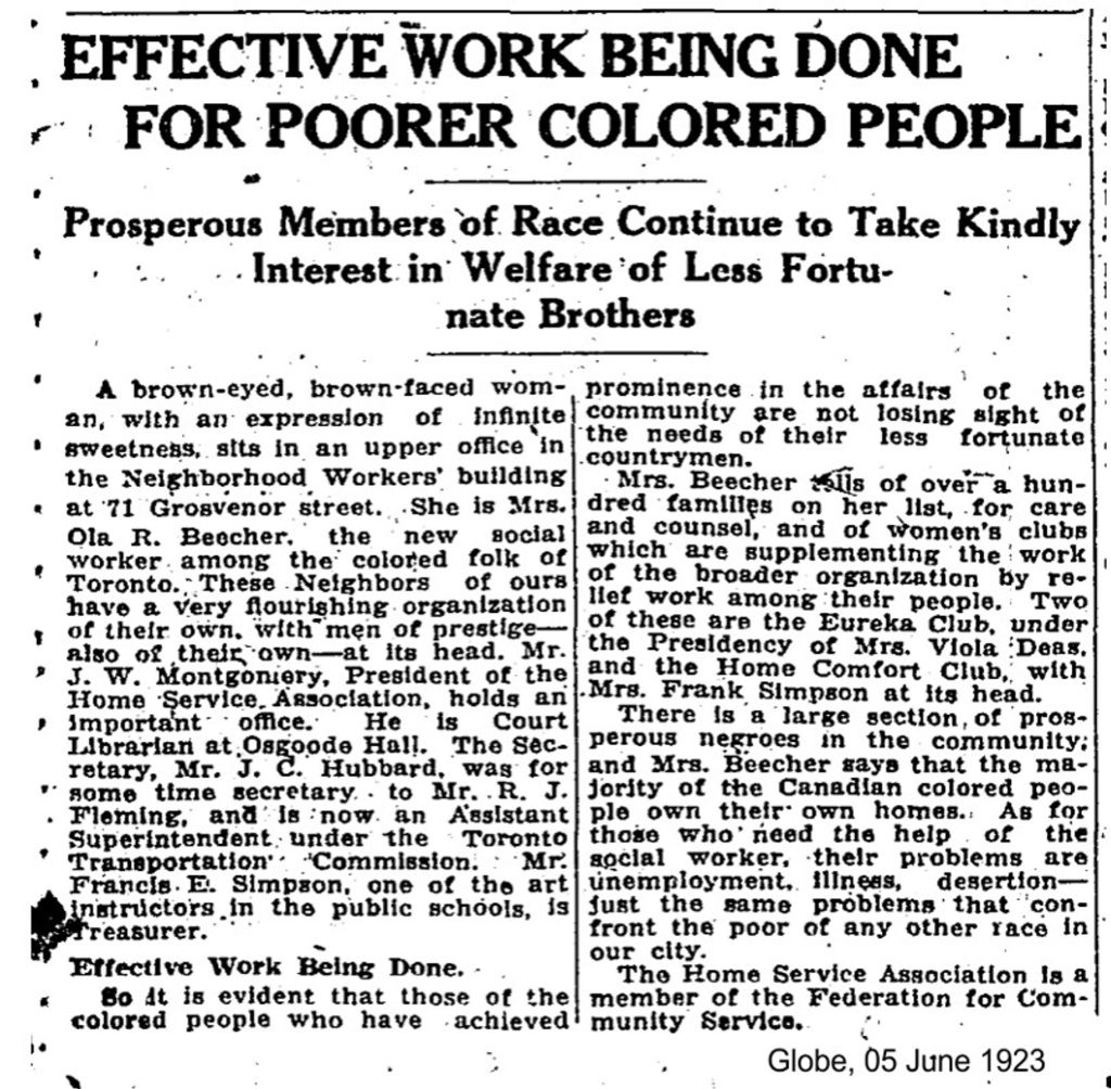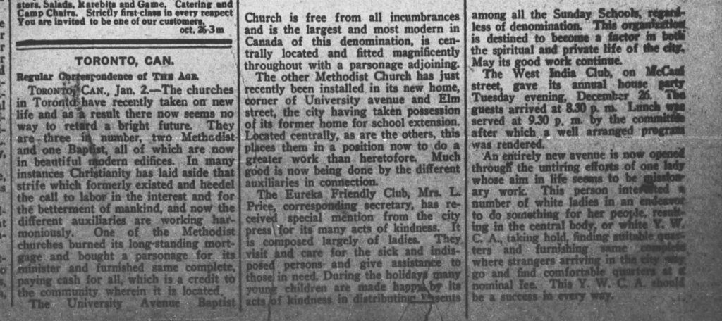 The Eureka Club was never larger than eighteen women. Viola Deas was another of those involved in the Eureka Club. Her husband Horatio, like many of the spouses of the Eurekas, was a railway porter as was Luella’s husband, Grandison. This may have been one of the things this handful of women had in common as, in this case, it was not their church. They came from all denominations: Anglican, Methodist, Baptist, Congregational, etc. Some lived in the East End. Viola Deas was later to live on Caroline Street. In 1980 at its 70th anniversary, the Eureka Friendly Club was the oldest black women’s organization in Ontario.