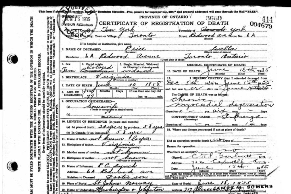 Luella Cooper continued to live in her apartment building on Redwood Avenue until she died on June 15, 1935, in York, Ontario. She was 76 years old. Her foster son, Robert C. Lynch reported her death. She was buried beside Grandison in the St. John of Norway Cemetery, on June 18, 1935. On her death certificate the neat handwriting of Robert J. Lynch has her “racial origin” as “Canadian”, but an official has crossed this out and written in “Coloured”.