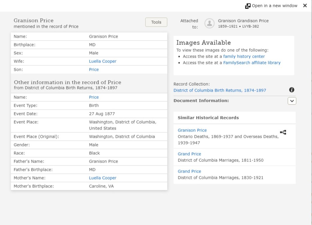 Luella Cooper was living in Washington, District of Columbia, USA, in 1870 at the time of the US Federal Census. She married Grandison Thomas Grandison Price on June 16, 1875, in the District of Columbia, USA. He was a messenger for the US Government. Both were listed as “mulatto”.