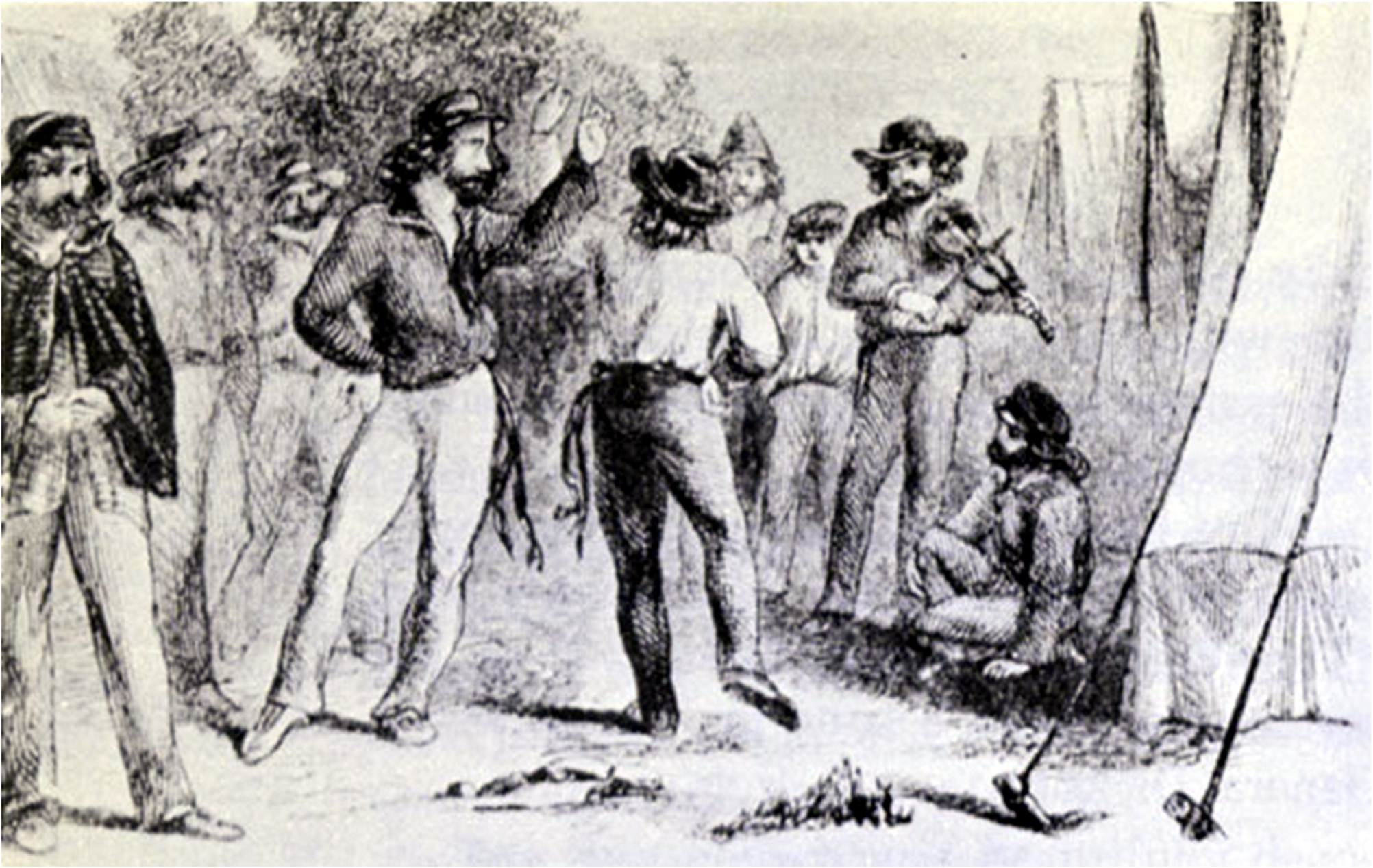 Métis in traditional costume dancing at Pembina, in what is now Manitoba, circa 1859. Source: Glenbow Library and Archives’ website/Image # NA-1406-24 (ww2.glenbow.org) © Public Domain nlc-8793
