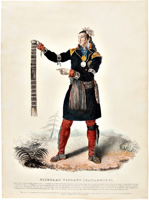 Handcoloured lithograph of the Huron chief, Nicholas Vincent Tsawanhonhi, drawn from an original painting by Edward Chatfield. Printed by C. Hullmandel, 1825.