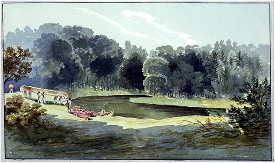 Previous Image Next Image Ottawa River Route 2 “Voyageurs Portage Canoes at Bend in Narrow River” John Elliott Woolford 1821