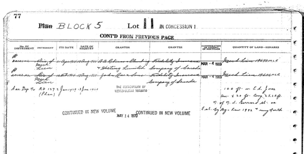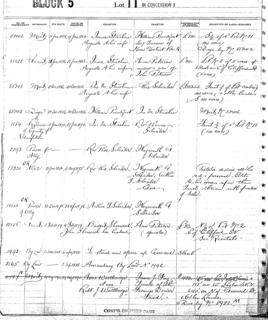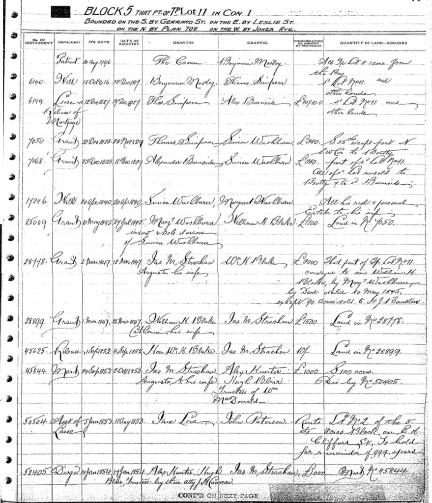 They bought land 60 feet wide and 400 feet deep (about 18 by 12 meters) for £20 through the Chief Justice, John Beverly Robinson. The Robinson family, prominent members of the Family Compact, owned land in the neighborhood. (Part of Pape Avenue was called Robinson Street for some time.) For more about John Beverley Robinson to to: http://www.biographi.ca/en/bio/robinson_john_beverley_9E.html