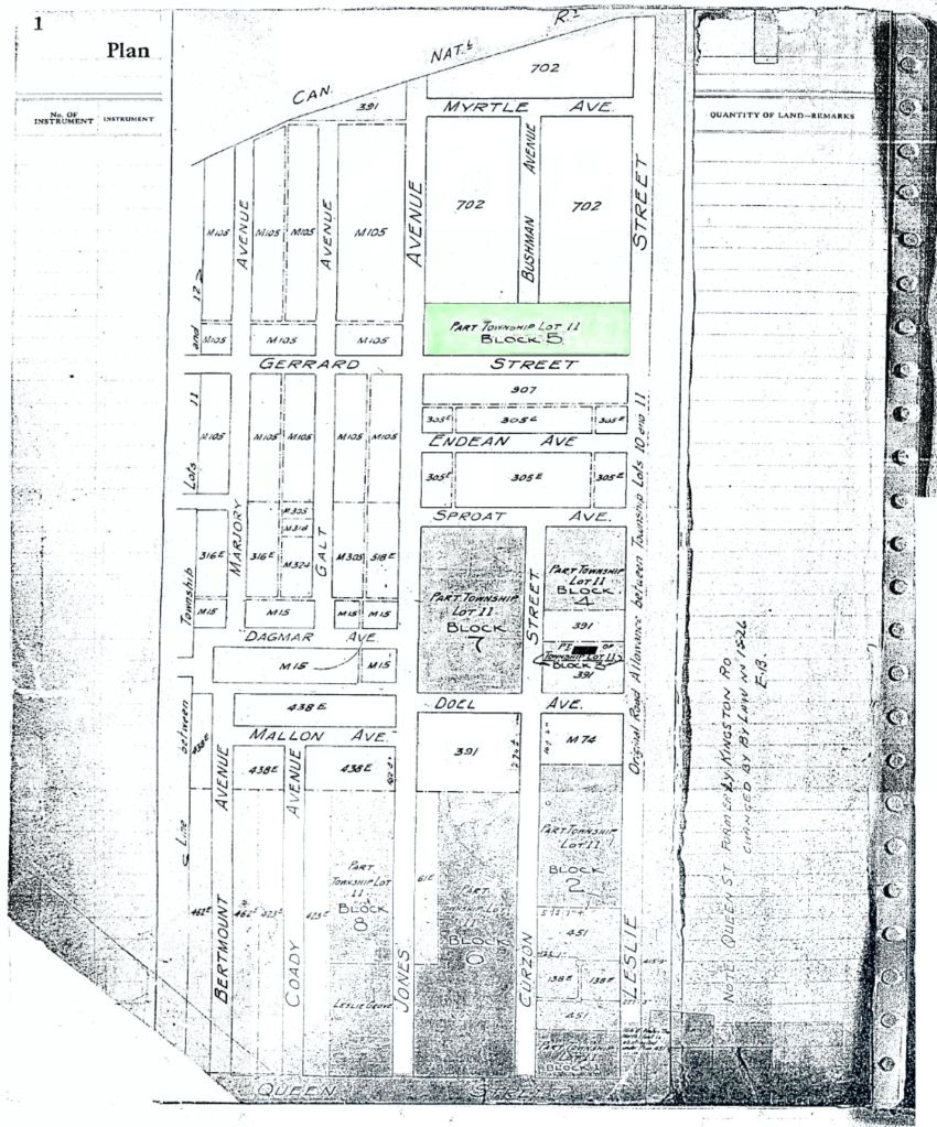 South of Austin Avenue, the creek flowed west of Marjory Avenue to diagonally south east to cross Dundas Street at Dagmar. It crossed at 61 Jones Avenue where there was heavy basement flooding. It ran behind the store front block on the north side of Queen Street (George Leslie’s house and selling grounds) and crossed Queen Street just west of his general store at the northwest corner of Queen and Curzon. It flowed through George Leslie’s nursery to cross Leslie Street and Eastern Avenue to enter Ashbridge’s Bay at the foot of Laing – the Gut. The Gut is where the City of Toronto Works Yard is now.