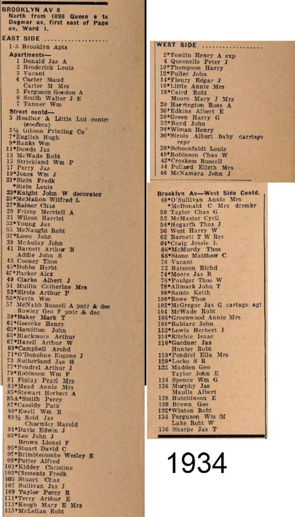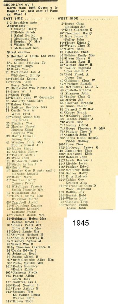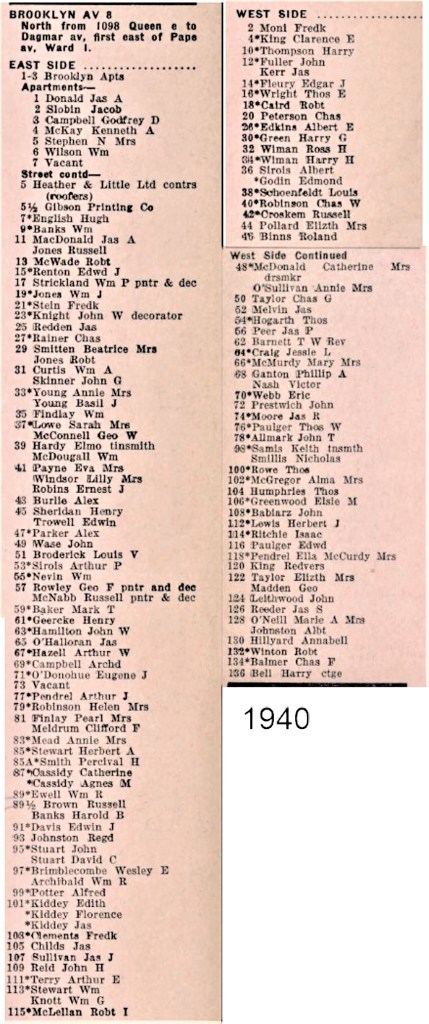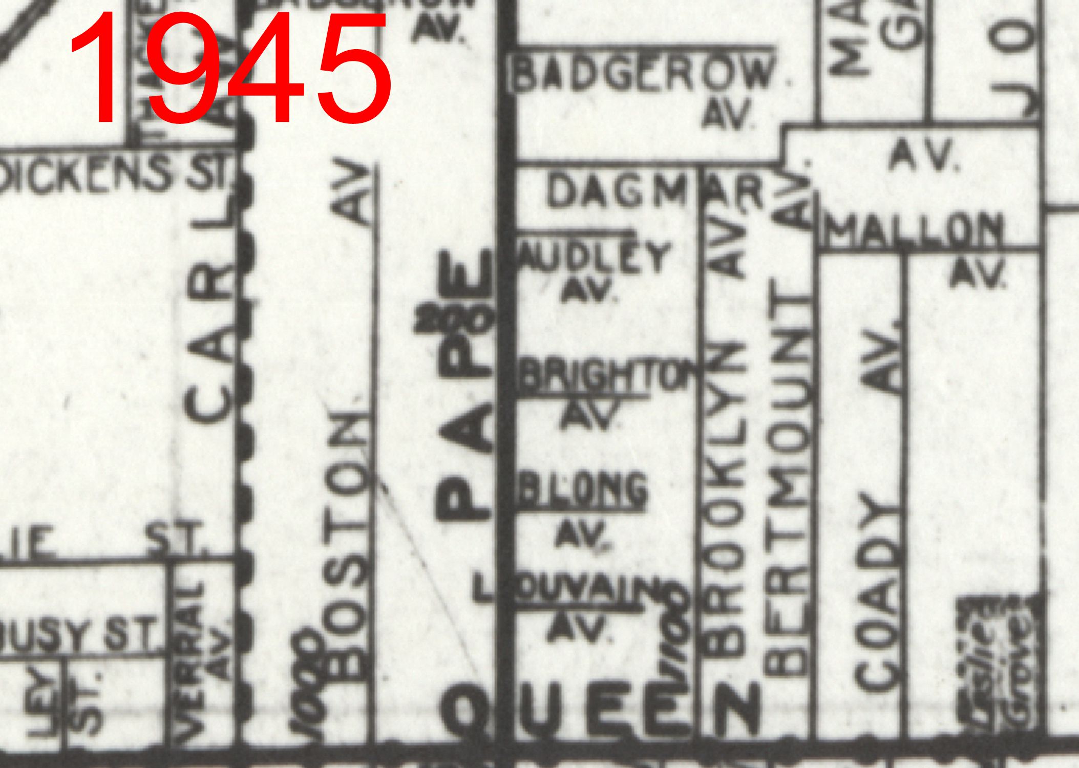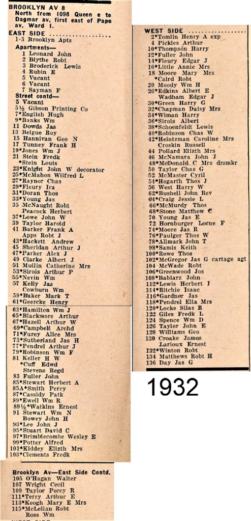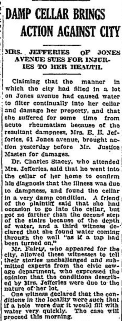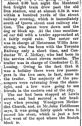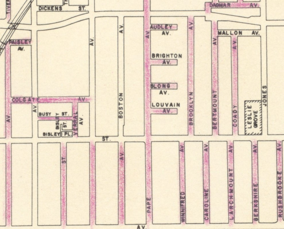 Leslie Creek started on the hill north of Blake Street, crossed the track, and ran down west of Leslie Street to cross Jones Avenue where this unfortunate woman’s house was. The creek was slow, muddy and a breeding ground for mosquitos which is why Lesliegrove Park was called “Mosquito Park.”