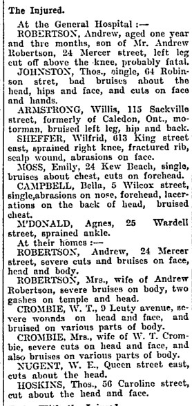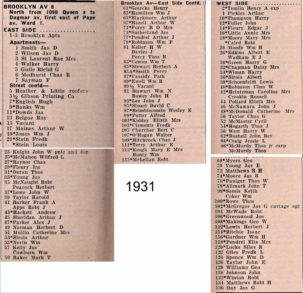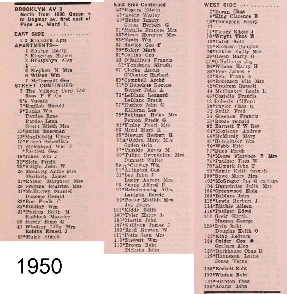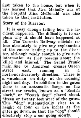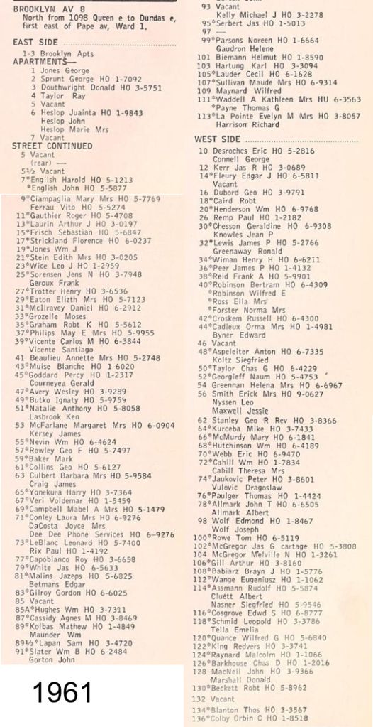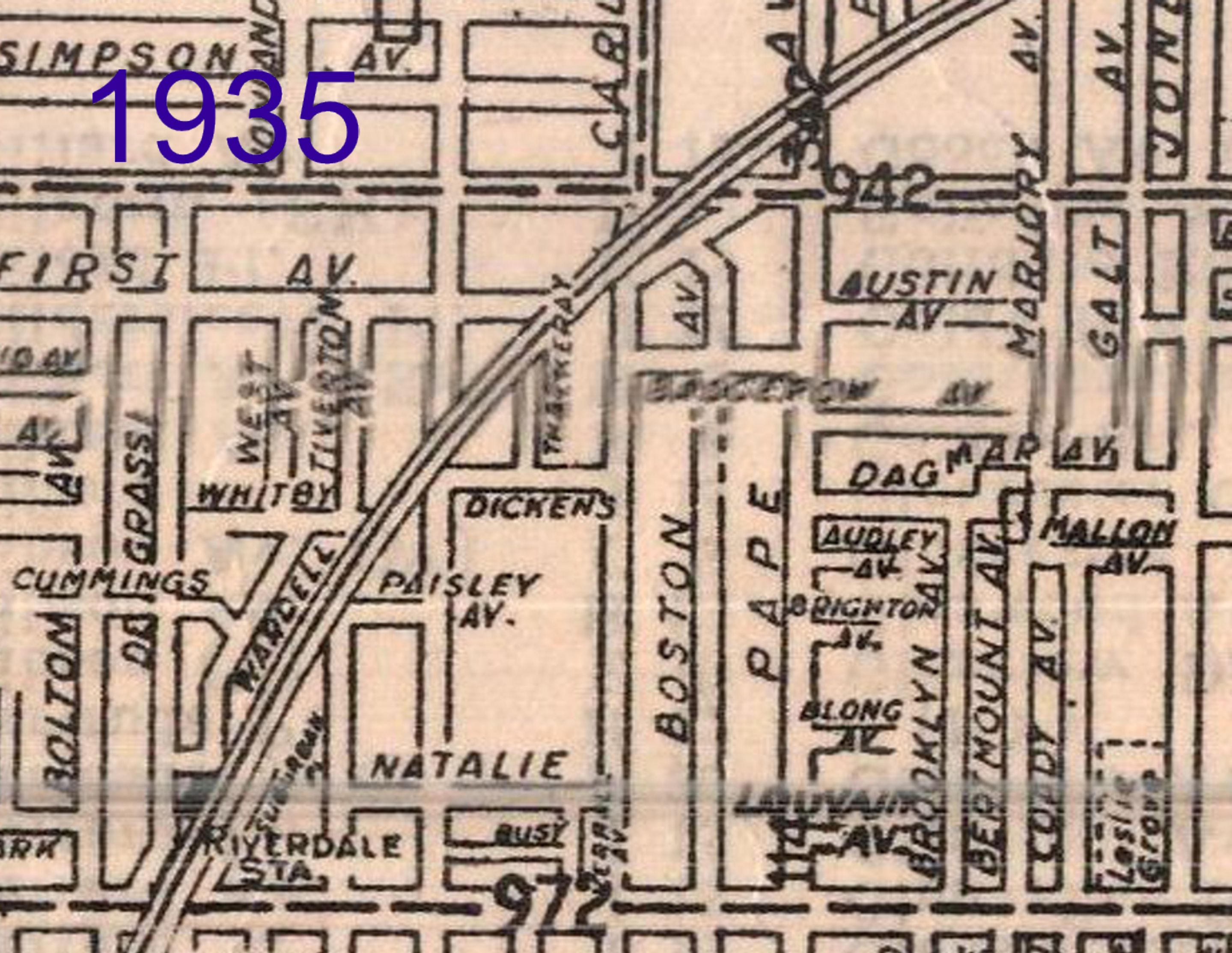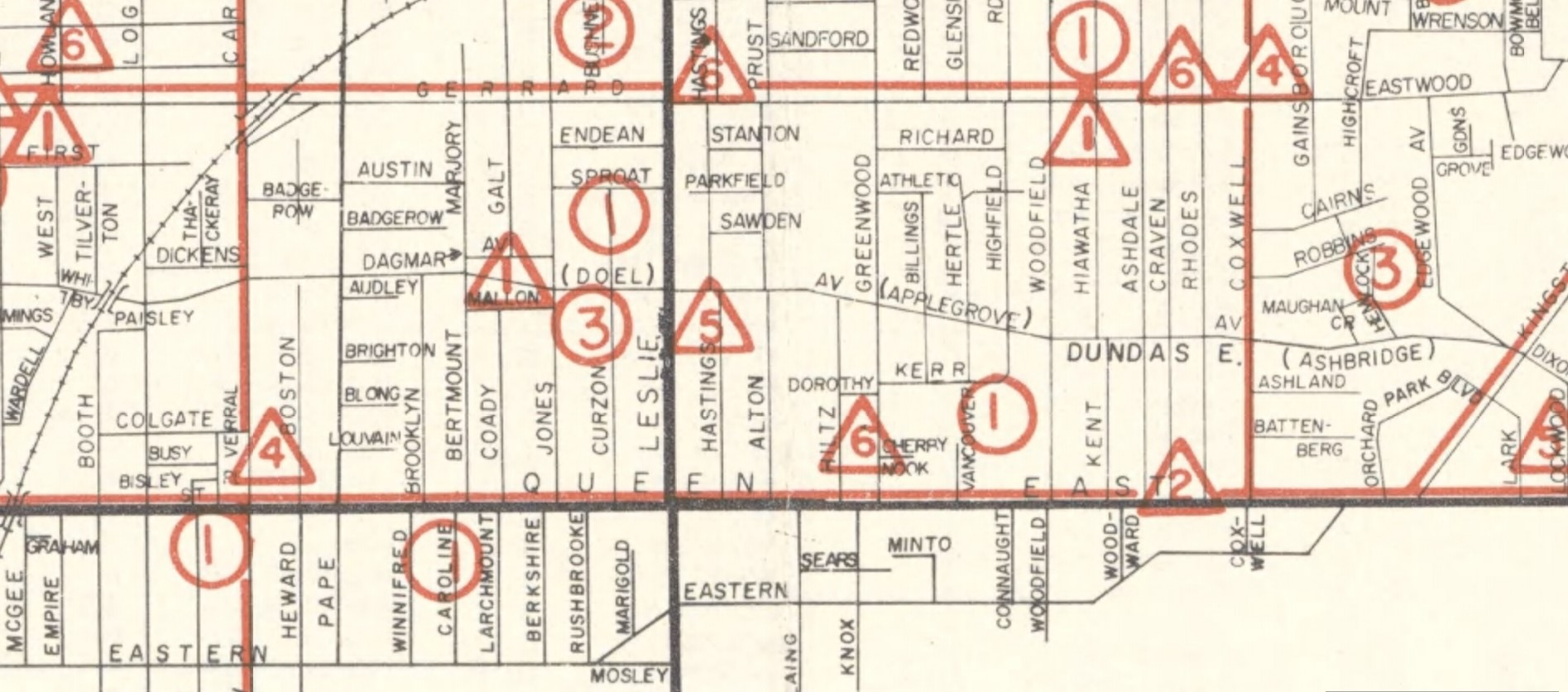 Leslie Creek started on the hill north of Blake Street, crossed the track, and ran down west of Leslie Street to cross Jones Avenue where this unfortunate woman’s house was. The creek was slow, muddy and a breeding ground for mosquitos which is why Lesliegrove Park was called “Mosquito Park.”