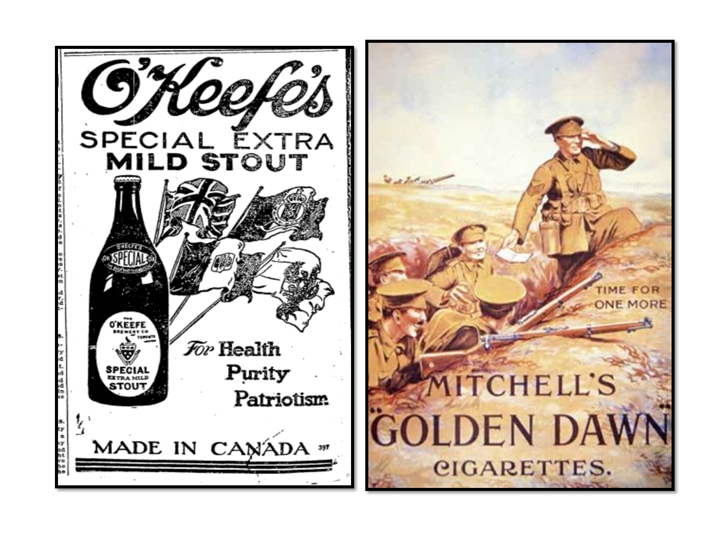 Alcohol, including beer, was available to the men in the trenches even when Prohibition banned here in Canada. Cigarettes were universal and even include in Queen Mary’s Comfort Boxes given to the troops.