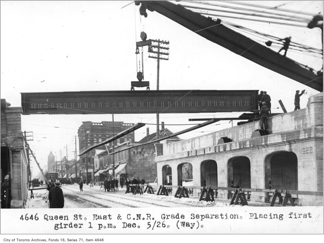 Queen St East and Canadian National Railway grade separation, placing first girder, 1 p.m., (Way Department) Creator: Alfred J. Pearson, December 5, 1926
