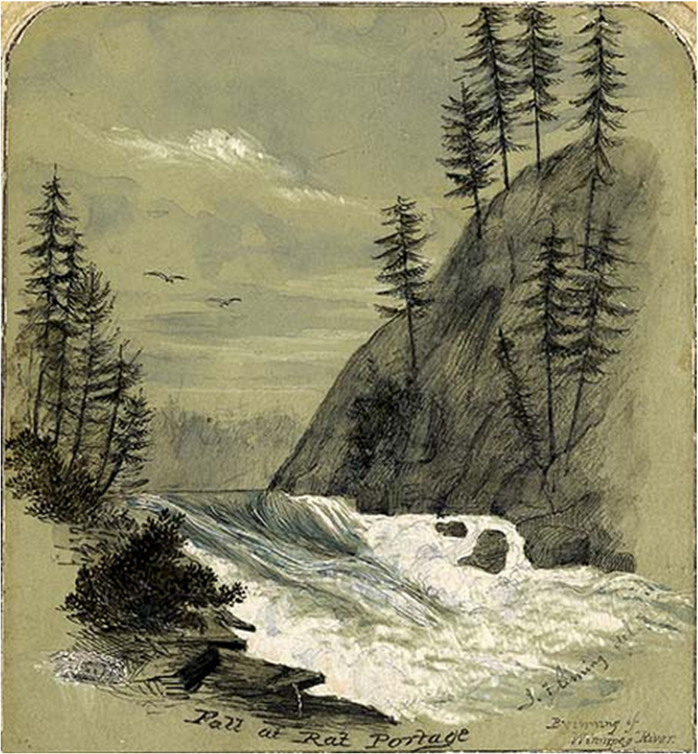 John Arnot Fleming. Fall at Rat Portage [Kenora], Winnipeg River, Ontario 1857. Pencil, grey & blue water colour. J. Ross Robertson Collection JRR 2357