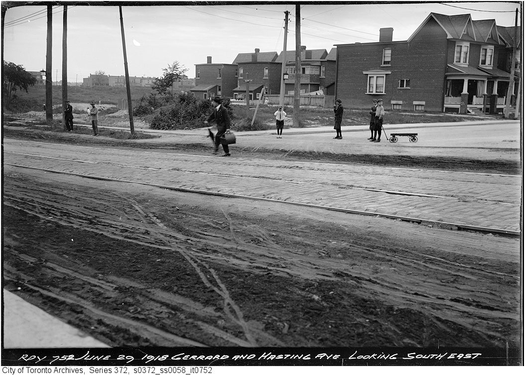 Gerrard and Hastings Ave. looking south east Photographer: Arthur Goss June 29, 1918 City of Toronto Archives Series 372, Subseries 58, Item 752