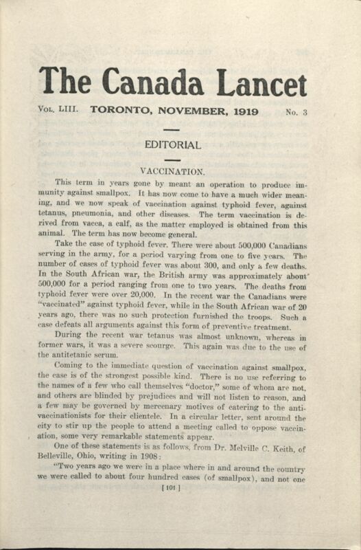 Previous Image Next Image The Canada Lancet on vaccination The official voice of Canadian doctors, Canada Lancet, supporting vaccination, November 1919