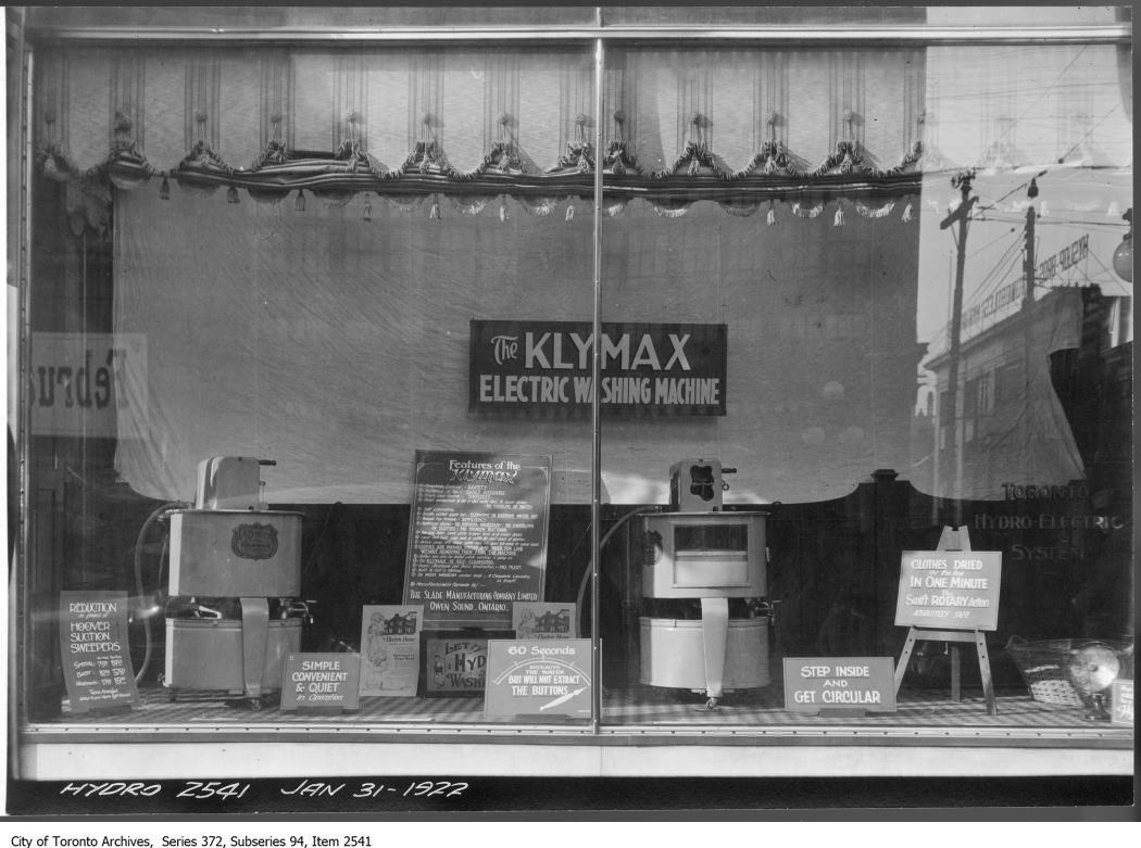 Previous Image Next Image The Klymax electric washing machine. – January 31, 1922 The Klymax electric washing machine, 31-Jan-22, Item 2541, Subseries 94, Toronto Hydro-Electric photographs