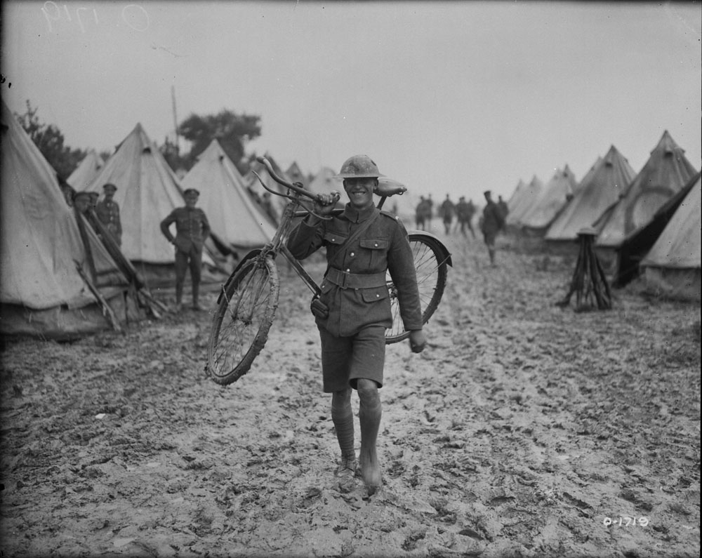 Unable to ride his cycle through the mud caused by the recent storm A Canadian messenger carries his horse August, 1917 Library and Archives Canada