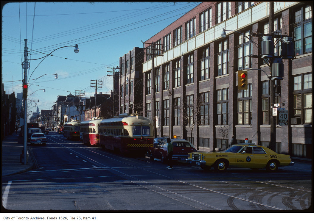 Previous Image Next Image View of old streetcar on Queen Street East View of old streetcar on Queen Street East. December 14, 1978 just west of River Street.