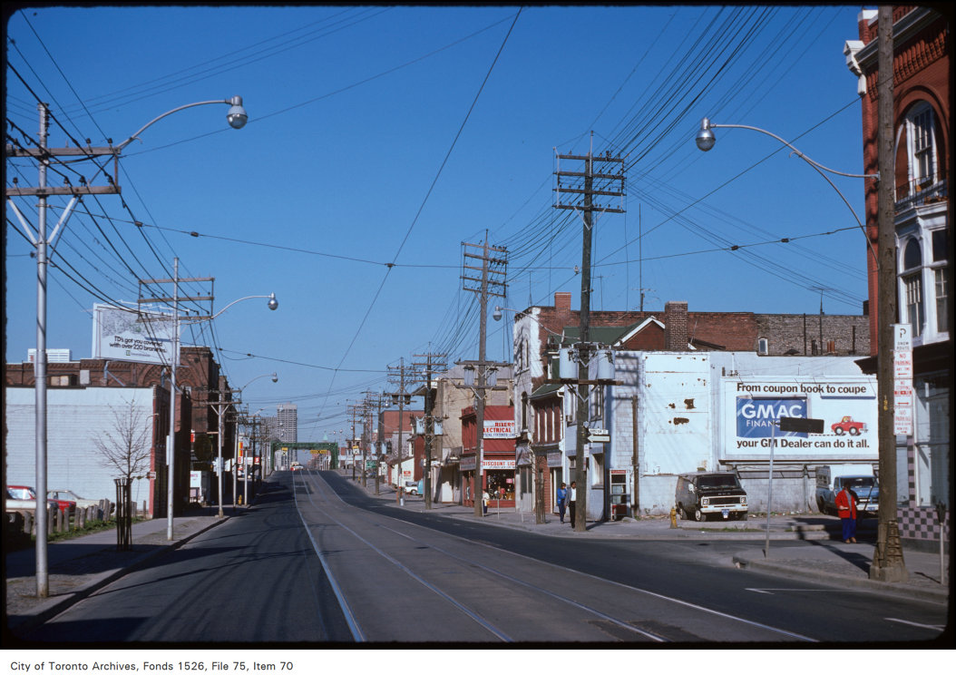 Previous Image Next Image View of Queen Street East, looking east to Don bridge View of Queen Street East, looking east to Don bridge, May 11, 1977