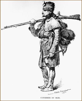 Voyageur or “courier du bois” with rifle and axe. 1891 Sketch by Frederic Remington. Glenbow Archives NA-1406-55 Published in “Harpers New Weekly”, March 1892.